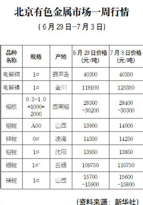 北京有色金屬市場一周行情[6月1日-6月5日]