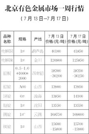 北京有色金屬市場(chǎng)一周行情[7月13日-7月17日]