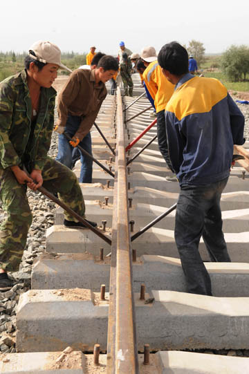 新疆喀(什)——和(田)鐵路8月9日正式鋪軌。新華社記者周文杰  攝