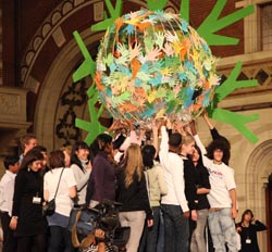 11月28日,在丹麥?zhǔn)锥几绫竟e行的“兒童氣候論壇”開(kāi)幕式上,來(lái)自世界各地的青少年代表用手托起一個(gè)手工制作的地球模型,向全世界發(fā)出了救救地球的呼聲。林淼 攝 (新華社發(fā)) |