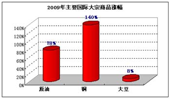 新年鐘聲已經(jīng)敲響;赝艿饺蛘仁姓叻龀值2009年,以原油為代表的國(guó)際大宗商品價(jià)格走出了低谷,上演出了一波可觀的止跌反彈行情。 統(tǒng)計(jì)顯示,2009年全年紐約NYMEX原油期貨價(jià)格自年初的每桶44美元左右升至年底的每桶80美元一線,漲幅接近80%。而對(duì)宏觀經(jīng)濟(jì)更加敏感的基本金屬漲幅更為明顯,倫敦LME銅期貨價(jià)格自年初的每噸3080美元漲至年底的7405美元,漲幅高達(dá)140%。農(nóng)產(chǎn)品則相對(duì)穩(wěn)定。以大豆為例,芝加哥CBOT大豆期貨年終價(jià)格每蒲式耳1048美分較年初的每蒲式耳972美分變化不大,漲幅僅為8%;若以年內(nèi)最高點(diǎn)1291美分計(jì)算,最大漲幅為33%。(見(jiàn)上圖) 經(jīng)過(guò)一年的止跌反彈,國(guó)際大宗商品2010年又會(huì)以什么樣的方式演繹呢?從宏觀經(jīng)濟(jì)、供需情況,以及市場(chǎng)流動(dòng)性問(wèn)題等方面綜合分析,筆者預(yù)計(jì)2010年上半年商品高位震蕩的可能性較大,后期隨著全球經(jīng)濟(jì)情況的進(jìn)一步好轉(zhuǎn),則有望再攀新高,不排除農(nóng)產(chǎn)品在2010年出現(xiàn)補(bǔ)漲可能,但需注意中、美等國(guó)何時(shí)收縮流動(dòng)性。這將極大的影響大宗商品上升的勢(shì)頭。