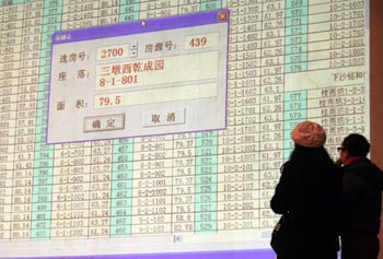 1月10日,選房的杭州市民在大屏幕前挑選經(jīng)濟(jì)適用房。 當(dāng)日,杭州新年第一次經(jīng)濟(jì)適用房公開(kāi)選房在杭州藝術(shù)學(xué)校舉行。據(jù)了解,本期經(jīng)濟(jì)適用房房源總計(jì)套數(shù)600套,總建筑面積4.03萬(wàn)平方米,主要分布在丁橋和三墩。新華社發(fā)