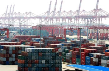 上海洋山深水港碼頭一景。上海市交通運(yùn)輸和港口管理局發(fā)布的數(shù)據(jù)顯示,預(yù)計2009年上海港的貨物吞吐量將完成5.8億噸,基本與上年持平。新華社記者 陳飛