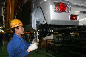 在昌河汽車日產(chǎn)400余輛的繁忙生產(chǎn)線上,工人們正在一絲不茍地安裝、緊固每一個(gè)零部件。記者 吳華國/攝 |