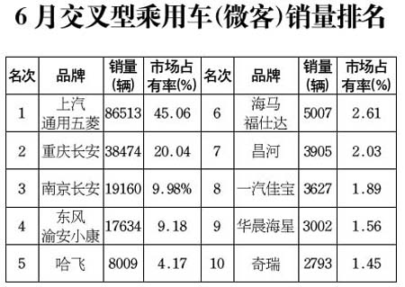 從6月份微客的銷售情況來看,排在前10名的品牌共銷售188124輛,占交叉型乘用車企業(yè)總銷量的98%。從排名情況看,排在前六名的品牌名次與上月沒有變化;奇瑞由上月的第七降為第十,華晨海星由上月的第八降為第九,昌河由上月的第九升為第七,上月第十的吉奧跌出十強(qiáng),一汽佳寶進(jìn)入十強(qiáng),排名第八。