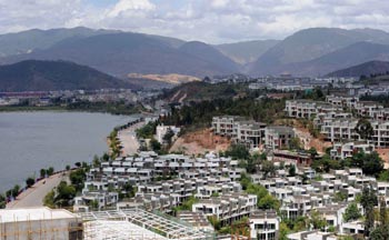 這是“洱海天域”度假產(chǎn)權(quán)式酒店項目俯瞰,在建的酒店和別墅群距離洱海最近距離僅有10多米,別墅群中心位置就是以前“情人湖”的所在地。新華社記者 藺以光
