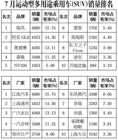 7月多功能乘用車(MPV)銷售3.10萬輛,環(huán)比下降10.10%,同比增長76.37%;其中2.0L、2.4L和1.8L排量車型銷量占比較大,銷量占比分別為24.01%、14.57%和14.19%。 與上月相比,除了東方之子Cross、開瑞優(yōu)雅排名不變外,瑞風(fēng)與別克GL8、奧德賽與森雅名次互換,菱智與途安闖入十強(qiáng),普利馬與風(fēng)行退出十強(qiáng),NV200與閣瑞斯名次均上升兩位,分別由第七、第九上升至第五、第七。 7月瑞風(fēng)表現(xiàn)最突出,較上月大增29.54%,超過GL8取得第一,GL8較上月下降13.82%,屈居第二;奧德賽較上月增長14.24%,取得第三,森雅表現(xiàn)不佳,較上月下降22.97%,退為第四;新品NV200較上月增長6.86%,閣瑞斯名次上升銷量下降,較上月下降15.28%;而處于高銷量后回落期的普利馬在上月環(huán)降27.22%后,7月無緣前10。 與上月相比,銷量排名前10位的MPV企業(yè),除了奇瑞排名第七不變外,其它均有變化。前六位中,江淮汽車與上海通用,廣汽本田與一汽吉林,鄭州日產(chǎn)與東風(fēng)柳汽名次互換,上海大眾憑借途安的表現(xiàn)闖入前十,海馬汽車退出十強(qiáng),華晨與福建戴姆勒名次均上升一位,分別由第九、第十上升至第八、第九。 |