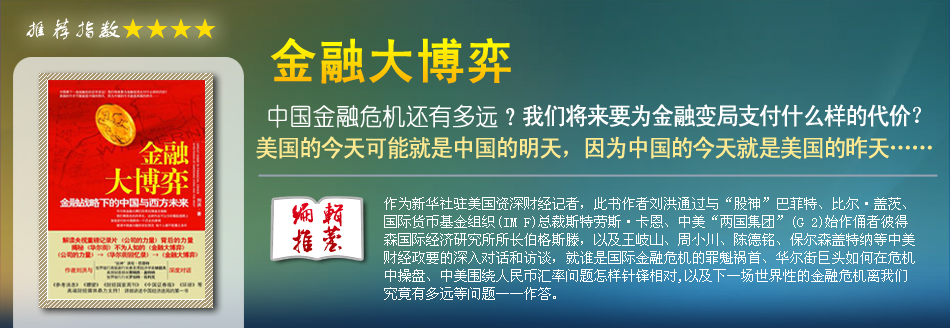 | 如果你覺得自己到現(xiàn)在為止也沒真正搞清楚金融危機(jī)與國際金融界到底是怎么一回事,劉洪的這本《金融大博弈——金融戰(zhàn)略下的中國和西方未來》會給你想要的答案。 |