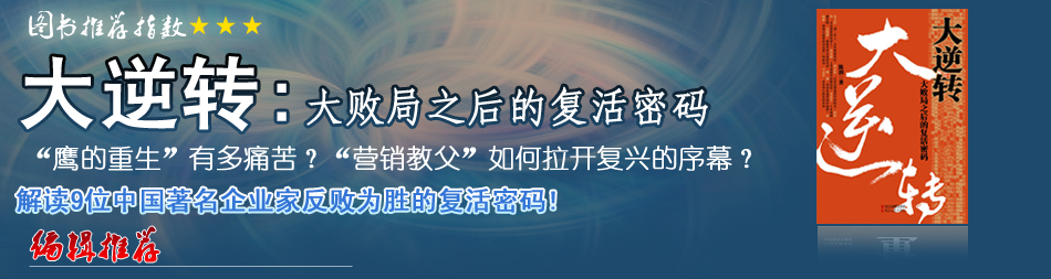 | 對(duì)于企業(yè)家而言,失敗只是華彩篇章中一個(gè)微不足道的逗號(hào)而已。財(cái)經(jīng)作家陳潤(rùn)在他的新書(shū)《大逆轉(zhuǎn)》中,就寫(xiě)了這樣一群不甘心失敗、再戰(zhàn)商業(yè)江湖,又重新獲得人生輝煌的企業(yè)家群體。從書(shū)中對(duì)這些案例的分析總結(jié),我們可以看見(jiàn)那些歷經(jīng)慘敗卻又從地上爬起來(lái)的企業(yè)家們所普遍具有的特質(zhì),那就是:狂野的夢(mèng)想、粗壯的神經(jīng)、冷靜的反思以及縝密的計(jì)劃…[詳細(xì)] |