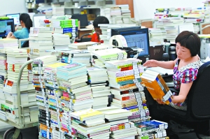 20日下午,工作人員在新首圖一層采編區(qū)內(nèi)對購進的各種新書進行信息采集和分類,為接下來的上架工作做準備。孫戉攝 |