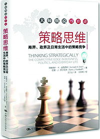 在《策略思維:商界、政界及日常生活中的策略競(jìng)爭(zhēng)》這本書中,作者首先從10個(gè)來(lái)自生活不同方面同時(shí)也別有生趣的策略故事開始,提供了一些怎樣才能發(fā)揮最佳水準(zhǔn)的初步概念,讓大家領(lǐng)略了指導(dǎo)策略決策的原理。然而,這僅是全書為數(shù)眾多的案例故事的一小部分,從囚徒困境到邊緣政策,從投票策略到討價(jià)還價(jià),策略競(jìng)爭(zhēng)真的隨處可見,競(jìng)技體育里是如此,商業(yè)職場(chǎng)里是如此,在日常生活甚至于政治和思想領(lǐng)域也是如此。