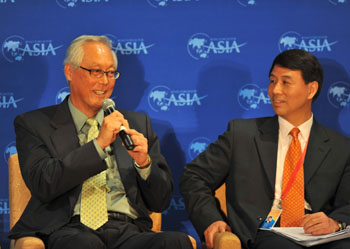 反貿(mào)易保護主義事關(guān)全球經(jīng)濟復蘇。4月10日,博鰲亞洲論壇“貿(mào)易保護主義:全球經(jīng)濟脆弱復蘇的現(xiàn)實威脅”主題午餐會在海南博鰲舉行。圖為新加坡前總理、國務資政吳作棟(左)在發(fā)言。新華社記者 郭程/攝