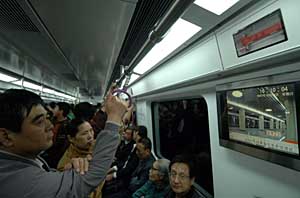 | 10月7日,北京地鐵5號線下午2:00正式售票開通試運營,軌道交通全路網(wǎng)票價2元.北京市民可以乘坐地鐵直接從城南豐臺區(qū)的宋家莊到達城北昌平區(qū)的天通苑。圖為乘客正在看5號線地鐵車里的顯示器。新華社記者