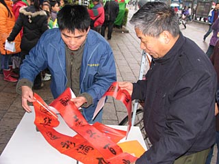 1月26日,福建省環(huán)保志愿者協(xié)會(huì)和省楹聯(lián)學(xué)會(huì)在福州市五一廣場(chǎng)組織“舊報(bào)紙換春聯(lián)、環(huán)保購(gòu)物袋”活動(dòng)。新華社記者 來(lái)建強(qiáng) 攝