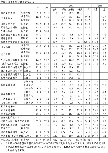2月份,受冰雪災(zāi)害的影響,我國產(chǎn)出、投資等實質(zhì)性經(jīng)濟指標的增長速度普遍回落,價格漲幅則迅速增大;緊縮性貨幣政策效果有所顯現(xiàn),金融運行狀況趨于平穩(wěn),進口增長速度大幅上升。