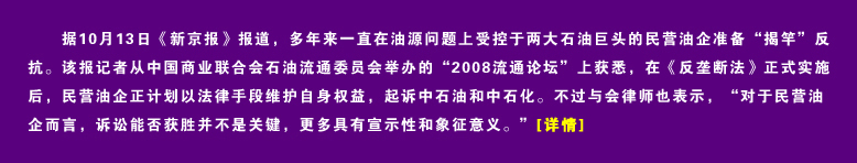 這無(wú)疑是民營(yíng)油企一次抱團(tuán)反壟斷的強(qiáng)勢(shì)突擊:“中國(guó)商業(yè)聯(lián)合會(huì)石油流通委員會(huì)”,就是由全國(guó)一百多家民營(yíng)石油、成品油經(jīng)營(yíng)企業(yè)組成的。這個(gè)行業(yè)協(xié)會(huì)是代表民營(yíng)石油企業(yè)們的意見(jiàn),形成話語(yǔ)權(quán),與強(qiáng)大的中石油和中石化進(jìn)行博弈。[詳情]