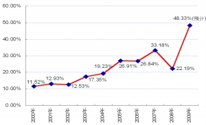 同時(shí),房地產(chǎn)業(yè)涉及的資源金額很大,是規(guī)模最大的單項(xiàng)商品。2009年商品房年銷售額預(yù)計(jì)會達(dá)到5.8萬億(圖1)。此外,從老百姓的開支來看,2009年房地產(chǎn)消費(fèi)占居民消費(fèi)的比例預(yù)計(jì)達(dá)到48.33%,接近一半(圖2)。也就是說,房地產(chǎn)對經(jīng)濟(jì)社會、對老百姓等方方面面來說,都是一件很大的事情。