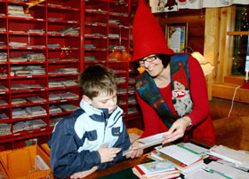 2日,在芬蘭羅瓦涅米的圣誕老人村里,圣誕老人郵局工作人員向一名來(lái)自英國(guó)的男孩展示從世界各地寄給圣誕老人的信件。