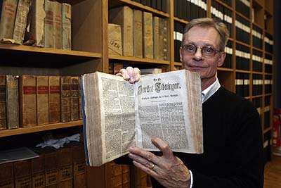 15日,在瑞典斯德哥爾摩,《國(guó)內(nèi)郵報(bào)》前主編展示1796年4月6日發(fā)行的報(bào)紙。瑞典《國(guó)內(nèi)郵報(bào)》發(fā)行了362年后在2007年舊貌換新顏,傳統(tǒng)的報(bào)紙發(fā)行退出歷史舞臺(tái),取而代之的是新興的網(wǎng)絡(luò)媒體形式!秶(guó)內(nèi)郵報(bào)》由瑞典女王克里斯蒂娜于1645年創(chuàng)立,是世界上發(fā)行時(shí)間最長(zhǎng)的報(bào)紙。 |