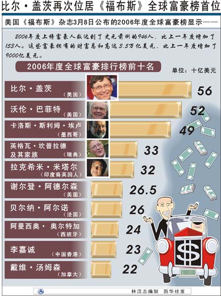 | 美國(guó)《福布斯》雜志近日公布2006年度全球個(gè)人財(cái)富排行榜,羅列了截至2月初個(gè)人資產(chǎn)市值達(dá)到或超過10億美元的946人。 按照排行榜制作者的說(shuō)法,《福布斯》排行榜不只是個(gè)人財(cái)富的簡(jiǎn)單羅列,同時(shí)也是全球經(jīng)濟(jì)及其變化的曲折反映。而近年來(lái)亞洲經(jīng)濟(jì)的蓬勃向上,也讓財(cái)富榜上涌現(xiàn)出越來(lái)越多的亞洲富豪。