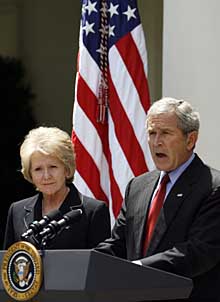 14日,美國總統(tǒng)布什(右)在華盛頓白宮發(fā)表講話,提出旨在減少美國對“不安定地區(qū)”石油供給的依賴程度,加強(qiáng)美國防務(wù)力量防止恐怖襲擊的計劃。 新華社/路透