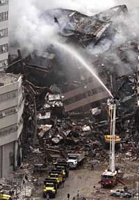 美國消防人員向紐約世界貿(mào)易中心大樓廢墟上噴水。本報(bào)資料照片 |