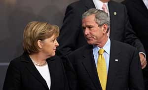 | 圖為德國總理默克爾(左)和美國總統(tǒng)布什。本報(bào)資料照片 | 八國集團(tuán)(G8)首腦會議6日在德國舉行,氣候變化問題是本次峰會的最重要議題之一。 主席國德國在決議草案中提出了減少溫室氣體排放等建議,但建議遭到了全球最大溫室氣體排放國美國的“根本性反對”。峰會前夕,美國總統(tǒng)布什出人意料地拋出美國應(yīng)對全球氣候變化的“長期戰(zhàn)略”,從而使八國集團(tuán)能否就氣候變化問題達(dá)成有效協(xié)議變得更加難以預(yù)測。
