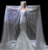 德國設計師卡爾作品 | 這場時裝秀的主題是“時間”,每個“像框”代表一種不同的時間概念!皞髌鏁r間”里,女模特身穿一件胸前綴滿白色表盤的黑色長裙,旁邊椅子上靜臥著一只大白兔!盎锇闀r間”里,兩個年輕女子守著一輛單車相依相伴!岸矶λ怪髁x時間”里,綴滿黑色、白色、紅色、黃色、藍色羽毛的直筒狀長上衣將模特裝扮得神秘莫測…… 近年來備受關注、尤其獲得好萊塢明星青睞的黎巴嫩設計師埃里·薩阿卜也在7月4日推出了秋冬時裝秀。他延續(xù)了一貫風格,以銀色、黑色為主色調(diào),大量使用絲綢與亮片,服裝高貴奢艷又不失嫵媚飄逸。別出心裁的是,他將時裝秀地點選在了一個馬戲場內(nèi),場中央用來圈出表演場地的寬闊圓圈代替了常見的T型臺,更加便于環(huán)坐四周的觀眾就近欣賞衣服的美妙。