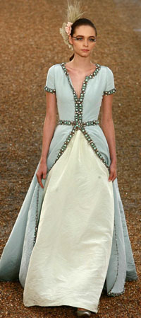 | 迪奧作品 | 另一位以創(chuàng)意大膽著稱的時裝界“頑童”讓-保羅·戈蒂埃則在7月4日讓人們大開眼界:一場純粹的女裝秀充滿了軍營氣息,甚至約定俗成最后一位出場的新娘也被帶著頭紗的新郎代替。 肩章,金色紐扣,垂在胸前的飾帶,被特意“拓”寬的肩膀……奢華、嫵媚的裙裝有了這些裝飾,平添一股英氣。軍服領上衣搭配緊身褲與長靴或者是帶褶痕、類似男褲的長褲,勃勃英姿呼之欲出。讓-保羅·戈蒂埃說,這場時裝秀體現(xiàn)了“女人才是強者”,因為女人可以在展現(xiàn)英姿的同時依然性感、敏感、浪漫。