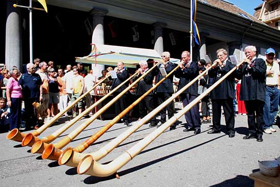 25日,幾位藝人在瑞士沃韋街頭吹響阿爾卑斯號角。當(dāng)日,沃韋舉辦第15屆街頭藝人節(jié),藝人們在沃韋老城街頭設(shè)立的7個演出點(diǎn)表演雜技、魔術(shù)等節(jié)目。