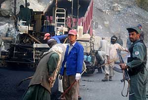 | 在武裝保安的保護下,一家中國公司的工人整修道路。余智驍