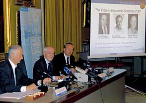 | 瑞典皇家科學(xué)院15日宣布,將2007年諾貝爾經(jīng)濟(jì)學(xué)獎(jiǎng)授予萊昂尼德·赫維奇、埃里克·馬斯金和羅杰·邁爾森(屏幕上由左至右)3名美國(guó)經(jīng)濟(jì)學(xué)家。新華社記者