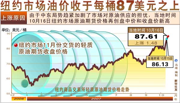 由于中東局勢(shì)趨緊加劇了市場(chǎng)對(duì)原油供應(yīng)的擔(dān)憂,16日紐約商品交易所11月份交貨的輕質(zhì)原油期貨價(jià)格每桶比前一個(gè)交易日上漲1.48美元,收于87.61美元,盤(pán)中一度觸及88.20美元,分別創(chuàng)下歷史最高收盤(pán)價(jià)和盤(pán)中價(jià)。