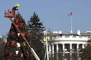 | 28日,在美國首都華盛頓白宮的南草坪,工人將一顆裝飾星放置在國家圣誕樹樹頂。國家圣誕樹的點燈儀式始于1923年,是美國圣誕節(jié)的傳統(tǒng)之一,2007年的點燈儀式將于12月6日舉行。新華社記者