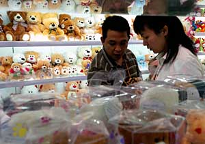 | 圖為一名美國客商在10月份舉行的第102屆中國進(jìn)出口商品交易會(廣交會)展館中與工作人員商談玩具出口事宜。本報(bào)資料照片 | 關(guān)鍵詞一:貿(mào)易平衡發(fā)展