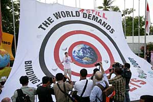 | 15日,在印度尼西亞巴厘島國(guó)際會(huì)議中心外,環(huán)保人士豎起一面面積達(dá)144平方米的標(biāo)靶圖案條幅,呼吁人們?cè)?007年聯(lián)合國(guó)氣候變化大會(huì)結(jié)束之后繼續(xù)關(guān)注氣候變化問(wèn)題。當(dāng)天,在這里舉行的聯(lián)合國(guó)氣候變化大會(huì)通過(guò)了“巴厘島路線圖”。新華社記者