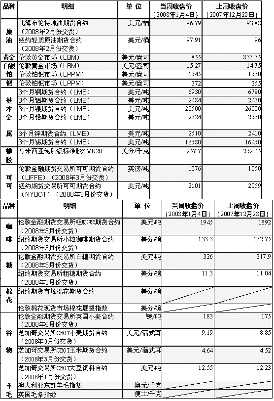 受非洲主要產(chǎn)油國尼日利亞國內(nèi)局勢持續(xù)動蕩、投資者擔心原油供應(yīng)緊張以及美元貶值等因素影響,國際油價在2008年的第一個交易日(2008年1月2日)即大幅上漲,當日紐約市場2月份交貨的輕質(zhì)原油期貨價格不僅歷史上首度突破每桶100美元大關(guān),而且創(chuàng)下每桶99.62美元的歷史最高收盤紀錄。 截至2007年12月28日的一周里,美國原油商業(yè)庫存比前一周下降400萬桶,降幅大于分析人士預(yù)期的170萬桶。受此消息影響,紐約市場經(jīng)過反復(fù)震蕩后開始沖高,3日盤中一度達到每桶100.09美元的歷史最高價。但隨后受交易者獲利回吐影響,當日收盤時該種原油期貨價格報收于每桶99.18美元,比前一個交易日下跌44美分。 美國勞工部1月4日公布的報告顯示,2007年12月份美國失業(yè)率上升到5%,高于前一個月的4.7%,為2005年11月份以來的最高水平。由于投資者擔心就業(yè)市場不景氣將影響美國消費增長,進而影響用油需求,4日國際油價繼續(xù)下滑。 歐佩克新任輪值主席、阿爾及利亞能源和礦業(yè)部長沙基卜·哈利勒1月5日表示,油價上升勢頭“很可能要持續(xù)到第一季度末”,預(yù)計到第二季度有望“穩(wěn)定”下來。 在美元疲軟、油價不斷突破紀錄的背景下,當周其他大宗商品的期貨價格均有不同程度的上揚。1月3日,紐約商品交易所2月份交貨的黃金期貨合約價一度摸高至每盎司872.9美元,與28年前創(chuàng)下的每盎司873美元歷史最高紀錄僅“毫厘之差”。倫敦市場的黃金期貨價格1月3日升至每盎司868.89美元的歷史高位,鉑的期貨價格創(chuàng)下每盎司1554美元的歷史新高。 亞洲最近處于季風季節(jié),潮濕的天氣影響了供給,橡膠價格因而走高。