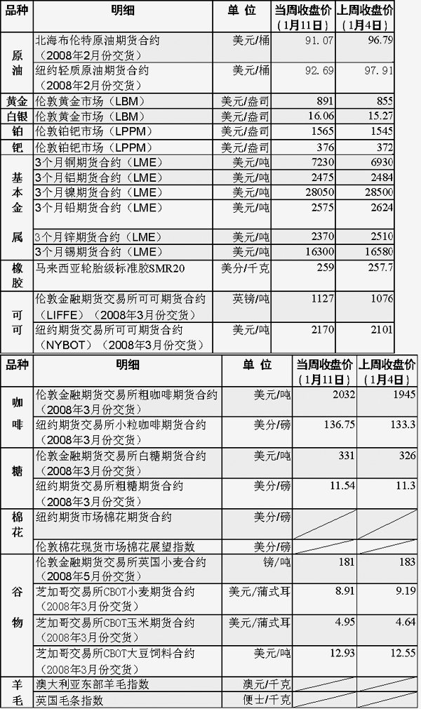 受美元走軟和供給趨緊雙重因素推動,倫敦市場鉑價(jià)創(chuàng)下每盎司1567.75美元的歷史最高紀(jì)錄,這已是該種商品期貨價(jià)格連續(xù)第二周創(chuàng)歷史新高。業(yè)內(nèi)人士預(yù)測,由于基本面良好、投資需求旺盛,這種白色金屬年內(nèi)很容易突破每盎司1800至2000美元的價(jià)格大關(guān)。 金價(jià)的再創(chuàng)新高也是當(dāng)周大宗商品市場的一大看點(diǎn)。11日紐約市場黃金期貨價(jià)格盤中突破每盎司900美元大關(guān),而倫敦現(xiàn)貨市場的黃金價(jià)格也創(chuàng)下898.03美元的歷史峰值。分析人士指出,投資者對美國經(jīng)濟(jì)前景的擔(dān)憂、美元持續(xù)貶值以及國際油價(jià)高位運(yùn)行都增強(qiáng)了黃金作為避險(xiǎn)保值工具的吸引力,也是推動黃金價(jià)格近來不斷上漲的主要原因。受金價(jià)影響,倫敦市場白銀價(jià)格也達(dá)到每盎司16.3美元,為27年來最高。 繼前一周盤中突破每桶百美元大關(guān)后,當(dāng)周紐約市場原油期貨價(jià)格有所回落,11日收于每桶92.69美元。市場人士稱,投資者當(dāng)前關(guān)注的焦點(diǎn)是美國政府最近公布的一系列“利空”經(jīng)濟(jì)數(shù)字以及這些數(shù)字所反映的住房市場和高油價(jià)所導(dǎo)致的經(jīng)濟(jì)問題。 基本金屬方面,除銅價(jià)外,倫敦市場基本金屬價(jià)格均有所回落。瑞銀集團(tuán)分析師羅賓·巴爾表示,由于市場對今年全球經(jīng)濟(jì)增速放緩和基本金屬供給充裕的擔(dān)心很難緩解,基本金屬價(jià)格可能會進(jìn)一步走低。 可可主產(chǎn)地科特迪瓦的罷工事件引發(fā)了市場對供給的擔(dān)憂,倫敦市場可可價(jià)格創(chuàng)下四年來最高。 11日,芝加哥期貨交易所的大豆期貨創(chuàng)造了每盎司13.1025美元的歷史最高紀(jì)錄;玉米期貨也達(dá)到了每盎司4.95美元,為11年來的最高水平。分析人士稱,通脹前景及市場處于供不應(yīng)求的格局令投機(jī)者看好農(nóng)產(chǎn)品市場,構(gòu)成市場利多因素。