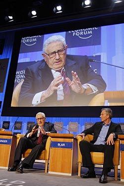 23日,在瑞士著名滑雪勝地達(dá)沃斯舉辦的世界經(jīng)濟(jì)論壇的新聞發(fā)布會上,英國前首相托尼·布萊爾(右)在聽美國前國務(wù)卿基辛格發(fā)言。新華社/法新