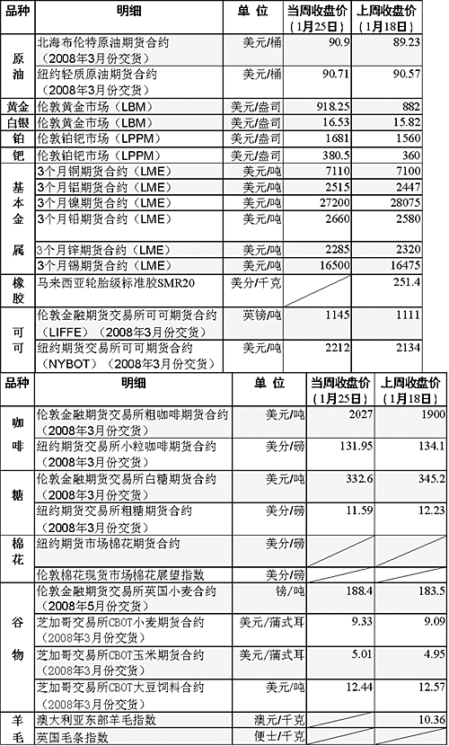 最近,南非全國出現(xiàn)缺電危機(jī),致使南非黃金和鉑金生產(chǎn)連續(xù)幾天處于癱瘓狀態(tài)。南非政府25日宣布,目前嚴(yán)重的電力短缺為“國家緊急狀況”,并警告短期內(nèi)還不能緩解缺電危機(jī),貴金屬價(jià)格因而走高。 倫敦市場(chǎng)鉑價(jià)在25日升至每盎司1701美元的歷史最高點(diǎn),黃金價(jià)格躍至每盎司923.73美元的歷史最高紀(jì)錄,白銀價(jià)格也增至27年來的最高點(diǎn)——每盎司16.61美元。受投資者擔(dān)心美國經(jīng)濟(jì)出現(xiàn)衰退影響,基本金屬價(jià)格漲跌不一。 國際原油市場(chǎng)上,投資者擔(dān)心,美國經(jīng)濟(jì)增速放緩甚至陷入衰退可能對(duì)全球原油需求產(chǎn)生抑制作用,而當(dāng)周初發(fā)生的全球股市暴跌更加劇了投資者的這種擔(dān)憂。美聯(lián)儲(chǔ)22日決定緊急降息0.75個(gè)百分點(diǎn),將聯(lián)邦基金利率即商業(yè)銀行間隔夜拆借利率從4.25%降至3.50%,以防止美國經(jīng)濟(jì)陷入衰退,同時(shí)也是為了恢復(fù)投資者信心,從而避免金融市場(chǎng)進(jìn)一步動(dòng)蕩,但交易商懷疑放寬貨幣政策能否真正使美國經(jīng)濟(jì)避免走上衰退道路,這導(dǎo)致當(dāng)周前幾個(gè)交易日國際油價(jià)下滑。 此后,受美國國會(huì)和政府就一項(xiàng)經(jīng)濟(jì)刺激計(jì)劃達(dá)成一致消息的影響,當(dāng)周國際油價(jià)又出現(xiàn)反彈。美國國會(huì)和政府24日宣布,雙方已就一項(xiàng)大規(guī)模經(jīng)濟(jì)刺激計(jì)劃達(dá)成一致。分析人士指出,該消息有助于緩解交易者對(duì)美國經(jīng)濟(jì)可能陷入衰退進(jìn)而導(dǎo)致其原油需求下降的擔(dān)憂,這是推動(dòng)油價(jià)上漲的主要因素。不過,由于降息將使美元進(jìn)一步走軟,將促使石油投機(jī)商今年秋季和冬季進(jìn)入石油市場(chǎng),可能推動(dòng)油價(jià)再次突破每桶100美元大關(guān)。 因擔(dān)心可可主產(chǎn)國科特迪瓦出現(xiàn)供給困難,紐約和倫敦兩個(gè)市場(chǎng)的可可價(jià)格反彈;糖價(jià)則結(jié)束了連續(xù)6周的上漲行情開始下滑。