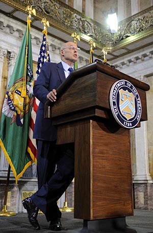 | 3月31日,美國財(cái)政部長亨利·保爾森在新聞發(fā)布會(huì)上發(fā)表講話。新華社記者