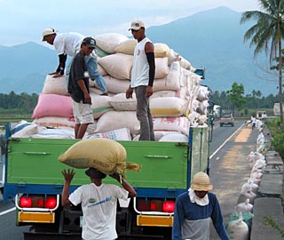 4月初,在菲律賓呂宋島北部的卡加延山谷,當?shù)剞r(nóng)民往車上裝載收獲的稻米。新華社記者 吳強