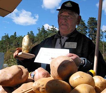 | 在保加利亞南部維林格勒市舉行的傳統(tǒng)土豆節(jié)上,一名保加利亞參展商展示其種植土豆的獲獎(jiǎng)證書和獎(jiǎng)杯。新華社記者 郭爽