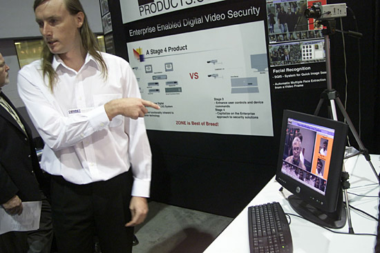 | 圖為美國一家公司的職員向參觀者展示快速影像識別搜尋系統(tǒng)。該系統(tǒng)可以從現(xiàn)場錄象中快速抓取影像,并用電腦中的資料對其身份迅速作出識別。新華社記者
