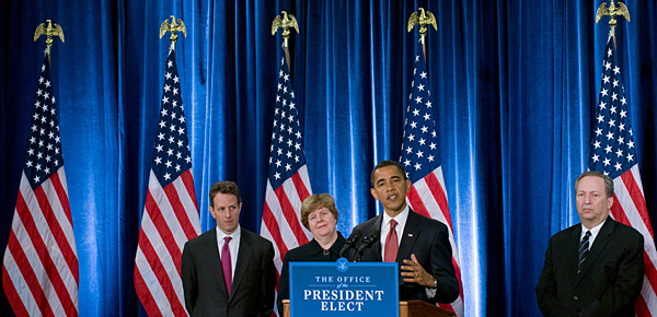 | 上圖為24日,美國當(dāng)選總統(tǒng)奧巴馬(右二)在芝加哥舉行的新聞發(fā)布會上正式宣布,提名蒂莫西·蓋特納(左一)出任新政府財政部長;提名勞倫斯·薩默斯(右一)為國家經(jīng)濟委員會主任;提名克里斯蒂娜·羅默(左二)為白宮經(jīng)濟顧問委員會主任。新華社/法新 |