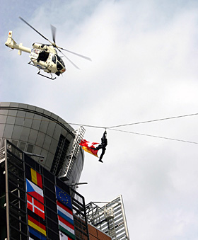 | 圖為2005年4月30日,一名特種兵在直升飛機(jī)的掩護(hù)下從歐盟委員會大樓的樓頂上沿繩索滑行而下進(jìn)行反恐表演。新華社記者