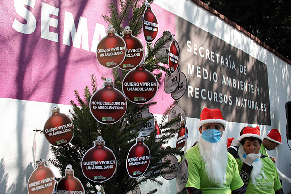 15日,在墨西哥城的環(huán)境和自然資源部前,近30名墨西哥綠色生態(tài)黨成員裝扮成圣誕老人參加集會,要求政府促進(jìn)銷售本國的圣誕樹,而不是賣其他國家的圣誕樹。