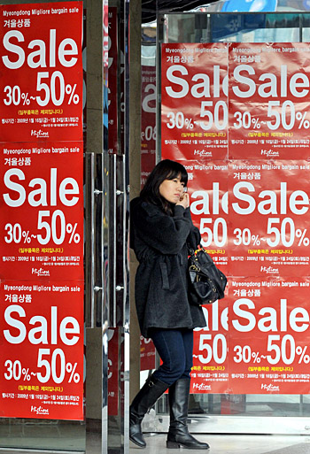 1月22日,在韓國(guó)首都首爾,一名行人經(jīng)過(guò)貼滿(mǎn)打折廣告的商場(chǎng)大門(mén)。韓國(guó)中央銀行韓國(guó)銀行22日發(fā)布報(bào)告說(shuō),由于國(guó)際需求持續(xù)下降導(dǎo)致制造業(yè)和出口惡化,去年第四季度韓國(guó)國(guó)內(nèi)生產(chǎn)總值(GDP)比前一季度大幅縮水5.6%。新華社/法新 | |