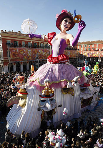 15日,在法國尼斯,女王花車參加第125屆嘉年華游行活動。當日,尼斯舉行盛大的嘉年華,各式各樣的花車加入到歡慶游行中。新華社/路透