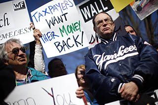 | 21日,在美國(guó)康涅狄格州美國(guó)國(guó)際集團(tuán)(AIG)總部外,抗議者手舉“納稅人想要回他們的錢”等牌板。當(dāng)天,康涅狄格州一個(gè)勞工團(tuán)體組織金融危機(jī)受害者前往AIG總部,抗議AIG在接受美國(guó)政府巨額資金援助的情況下仍向部分高管和員工發(fā)放高額獎(jiǎng)金。新華社/路透 | 美國(guó)康涅狄格州總檢察長(zhǎng)理查德·布盧門塔爾21日說(shuō),保險(xiǎn)業(yè)巨頭美國(guó)國(guó)際集團(tuán)(AIG)提交文件顯示,公司前一周(指9日至15日)共發(fā)放2.18億美元獎(jiǎng)金,比先前公布數(shù)額多5300萬(wàn)美元。他要求公司作出解釋。 AIG發(fā)放巨額獎(jiǎng)金一事引發(fā)眾怒,美國(guó)19州宣布展開(kāi)聯(lián)合調(diào)查。但白宮發(fā)言人說(shuō),總統(tǒng)貝拉克·奧巴馬可能會(huì)在獎(jiǎng)金征收重稅問(wèn)題上態(tài)度有所緩和,以確保相關(guān)公司不會(huì)退出政府金融業(yè)救助計(jì)劃。